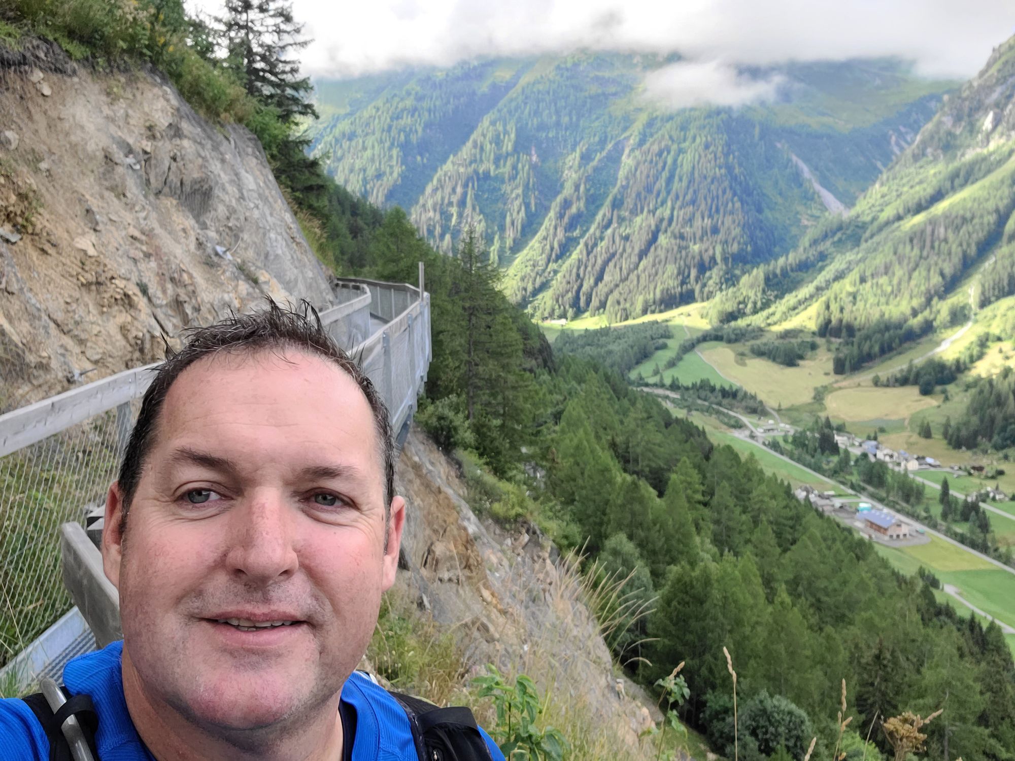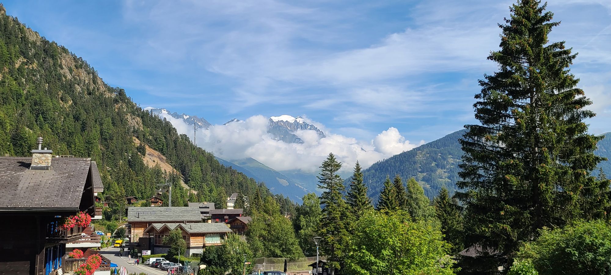 When I woke up I was feeling good and ready for the day. The breakfast at the Grand Ourse was pretty bland and basic, first come first serve. I had a quick bite packed up and headed out. You start the hike by walking past the big pink church then into the woods. The trail really heads straight up from there. Basically you have to hike to get to the hike. The trail has slight switchbacks but is steep and demanding for the first 400 feet until you get to the road. Once there you cross a pedestrian bridge over the highway and continue above the road. The trail has another steel bridge built into the mountain to get across a ravine. If you have any sort of fear of heights this is a bridge that will give you a bit of worry. It is very stable and strong, just high up and about 100 feet long. Once through the path continues and you meet the road again and see the Hotel du Col de la Forclaz. While I was hiking through there was a tour group in front of the Hotel all of High school age young men. As I looked over they were wildly playful with mischievous behavior and the egoism of young men. I smiled, thought of my youth and a specific school trip I had to New Mexico and southern Colorado. I felt a certain amount of sympathy for the teachers or chaperones they had with them.