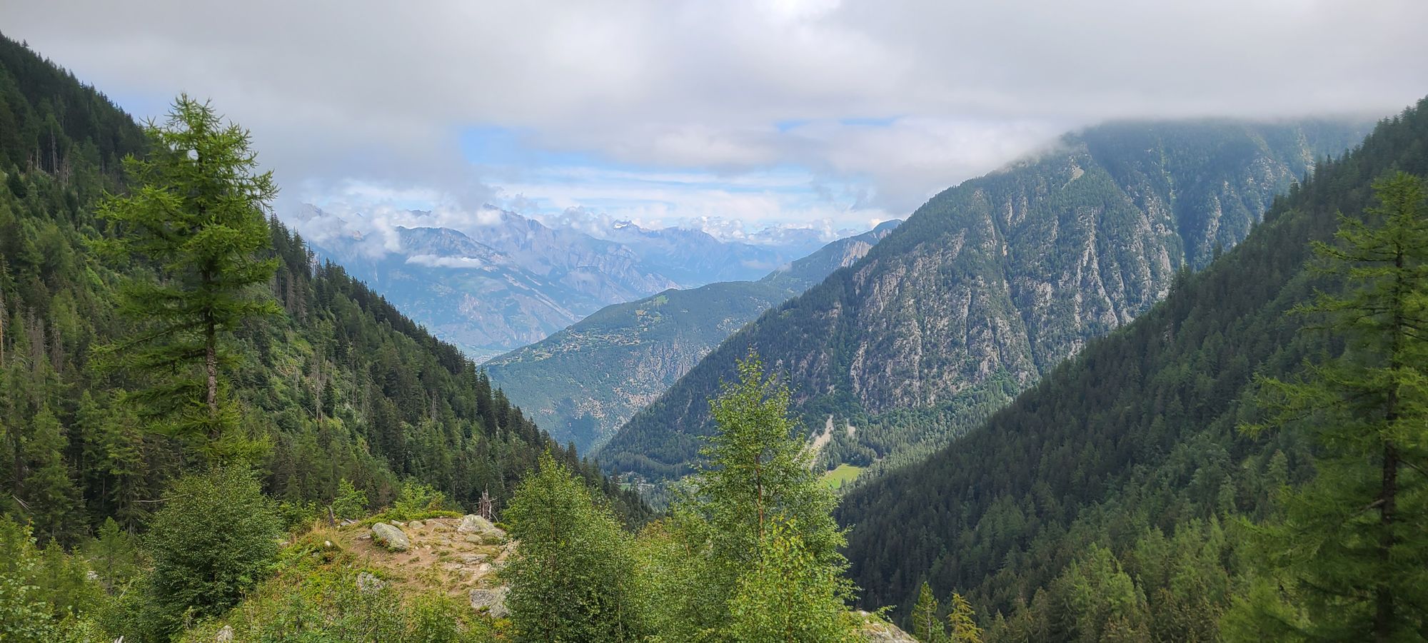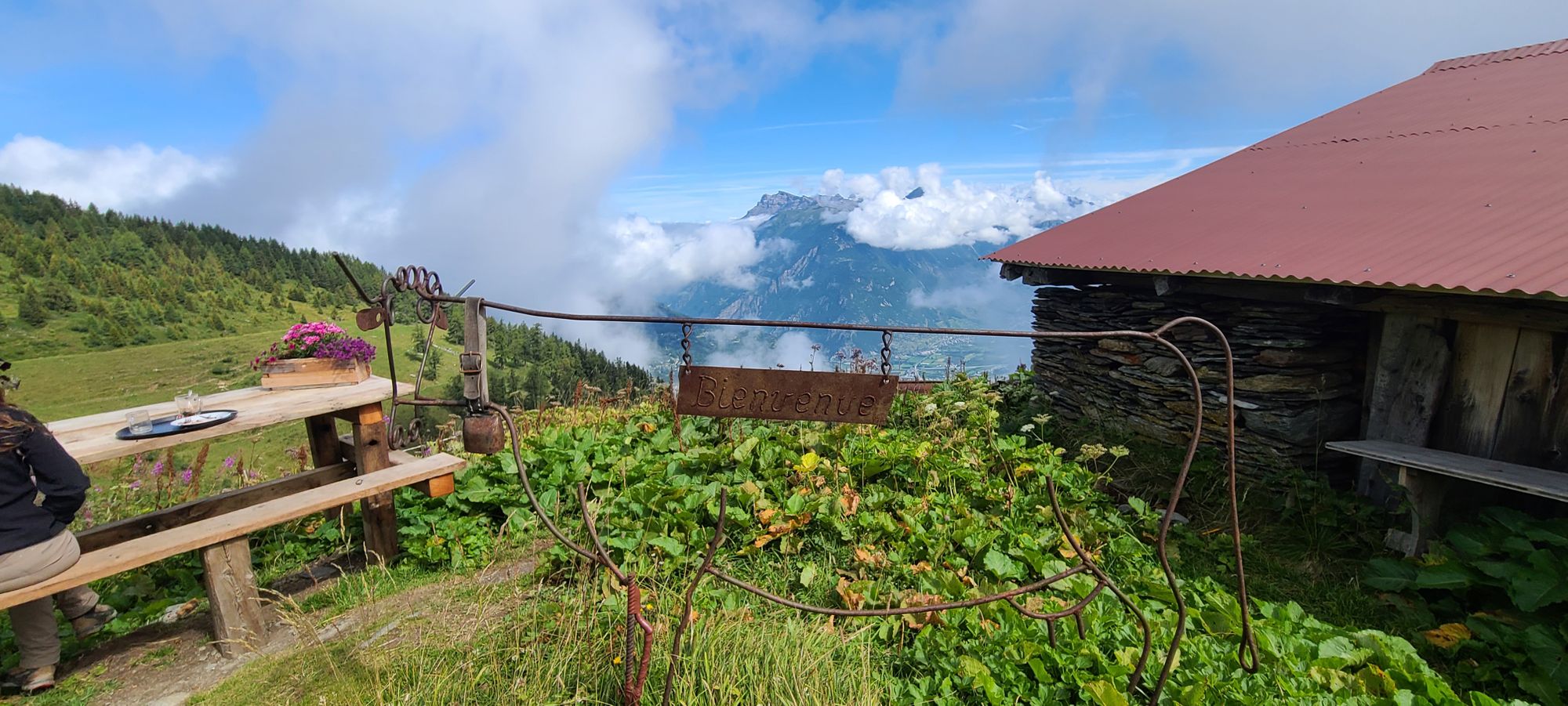 This was now the start of the hike and the trail started to slowly rise and cross the side of the mountain. You could see the trees and forest fall away below quickly to the left into a valley. The steep drop down increased quickly to and far in the distance you could see the city Martigny. After a good mile of trekking the trail gets steep and you see again the intensity of hiking in the Alps and the truth is that this is an easy day. As I was hiking there were a few runners that looked like they were training for the UTMB. https://utmbmontblanc.com/en/home A race that circles Mont Blanc 106 miles and 32,000 feet of elevation gain and has to be a superhuman feet to complete. In a short time I reached the Col de la Forclaz and realized that I had completed the majority of the elevation gain for the day. There was a group of trekkers at the Col and were all taking a break so I headed to the Alpage de Bovine. It is a refuge at the top with a restaurant and farm that overlooks the majestic peaks and Martigny in the distance. I stopped there and had probably the best cheese omelette I have ever tasted. I sat down, ate my second breakfast and chatted with two women from Indiana. Mother and daughter who decided to hike a few sections of the route on their trip to the Alps. Each of them had the largest backpacks I think available for a trek like this. I was astounded that they were carrying so much. Looking at my 15 liter pack I was grateful and happy I was moving with the basics. The views from here are amazing and it is a spot I wanted to spend a good amount of time at. Everywhere you look are amazing mountains, pastures, valleys, trees and cities in the distance. Just incredible.